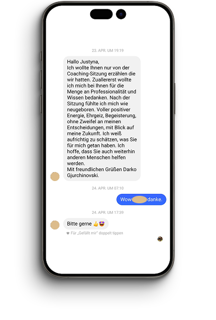 … ich wollte Ihnen nur von der Coaching-Sitzung erzählen, die wir hatten. Zuerst wollte ich mich bei Ihnen für die Menge an Professionalität und Wissen bedanken. Nach der Sitzung fühlte ich mich wie neugeboren. Voller positiver Energie, Ehrgeiz, Begeisterung, ohne Zweifel an meinen Entscheidungen, mit Blick auf meine Zukunft. Ich weiß aufrichtig zu schätzen, was Sie für mich getan haben. Ich hoffe, dass Sie auch weiterhin anderen Menschen helfen werden.